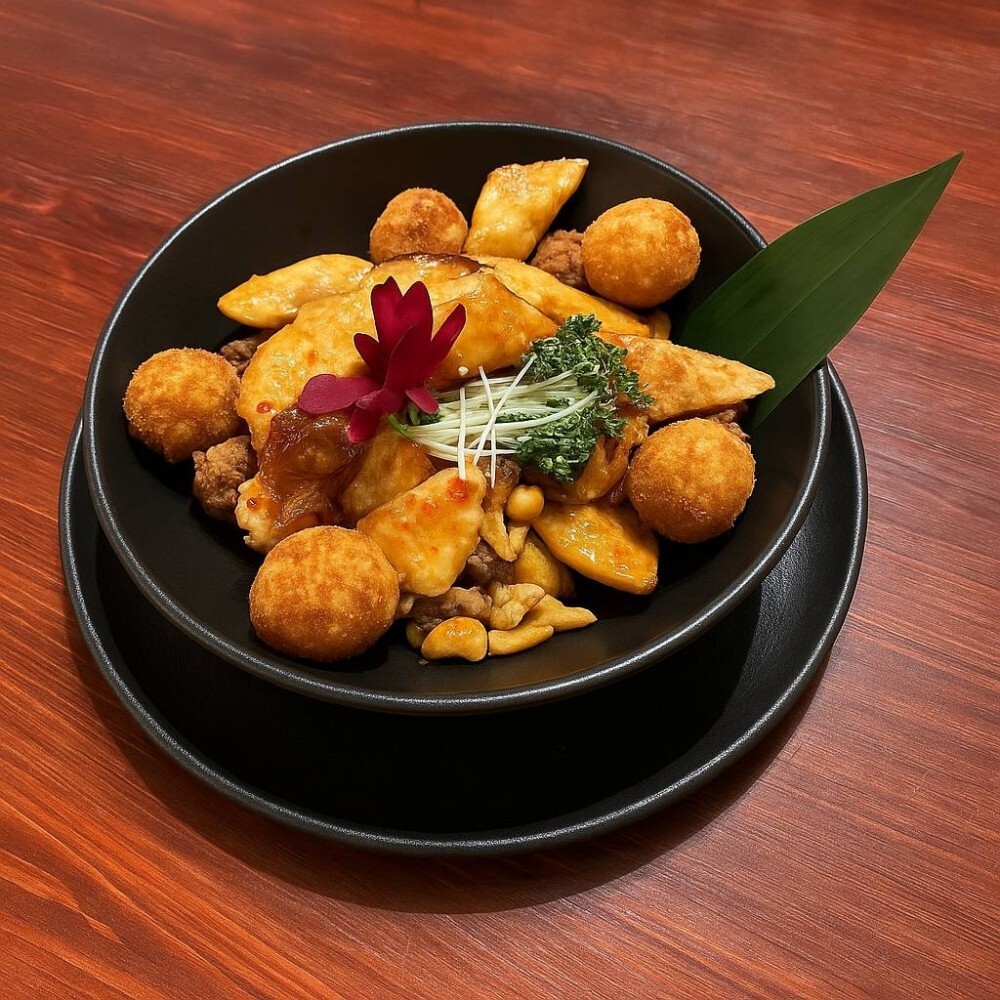 Баклажан, перец болгарский, вырезка говяжья, сыр творожный, соус сладкий чили, кешью, яйцо