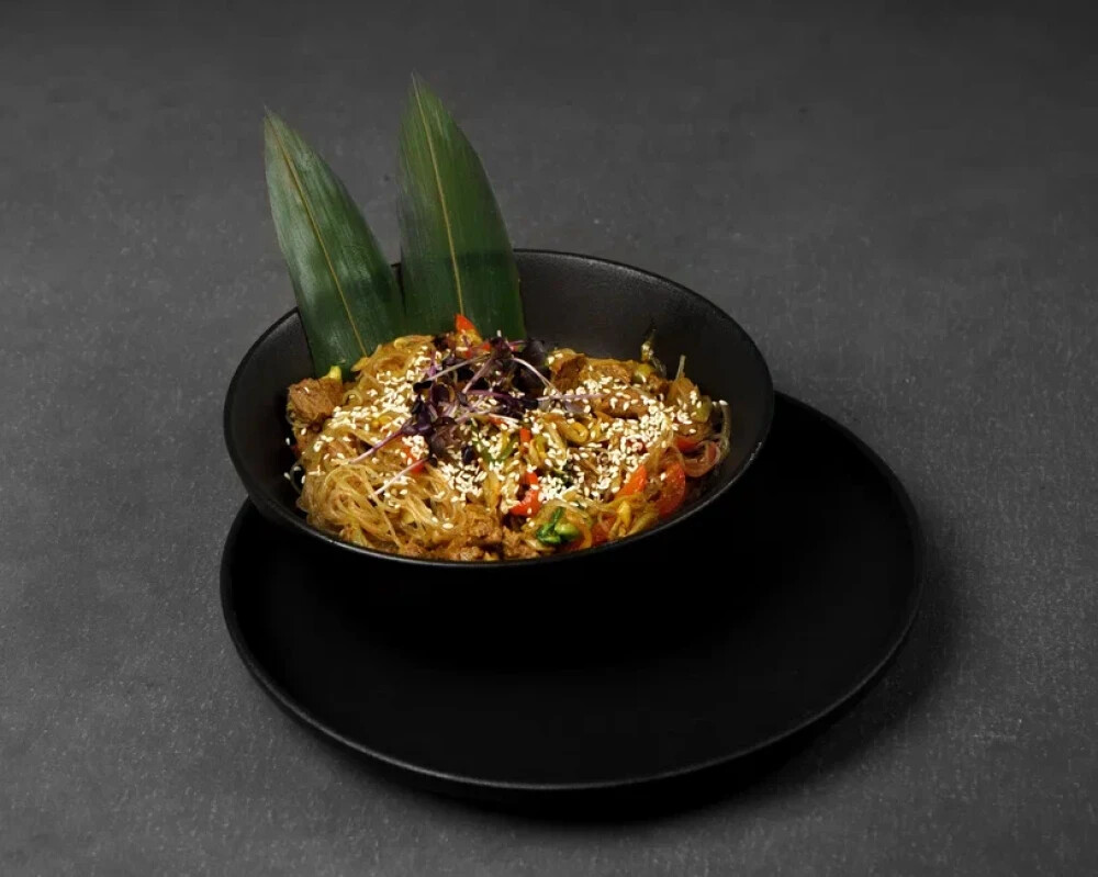 Фунчоза, креветка тигровая, лосось, осьминог, перец болгарский, капуста пак чой, ростки сои, бобы эдамаме, соус соевый, лук порей, микрозелень, кунжут