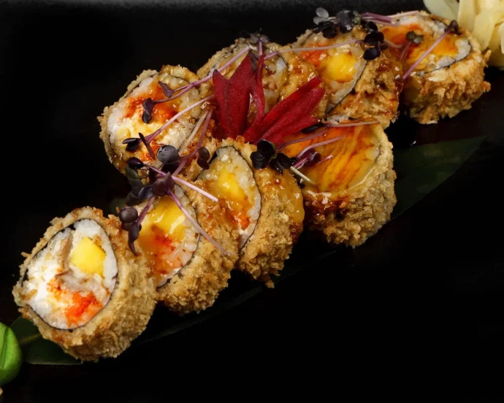 Нори, рис японский, сыр творожный, кляр, сухари панко, угорь, икра тобико, манго, соус манго, соус унаги