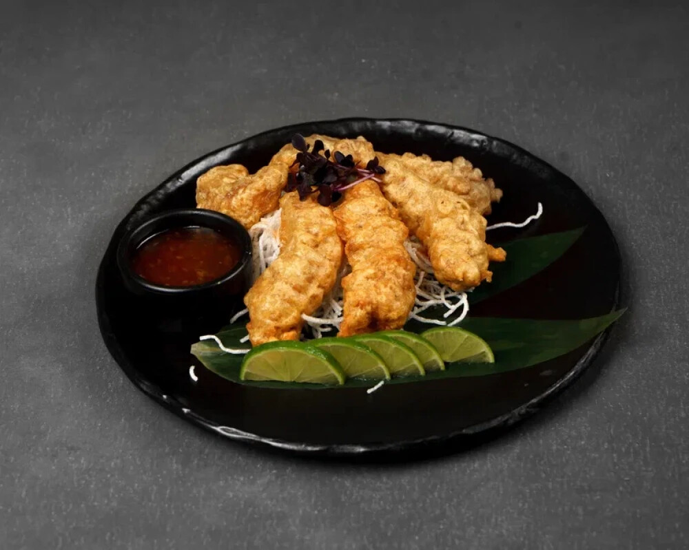 Фунчоза, креветки тигровые, лайм, соус соевый, соус кимчи, соус сладкий чили, кляр на основе японской муки