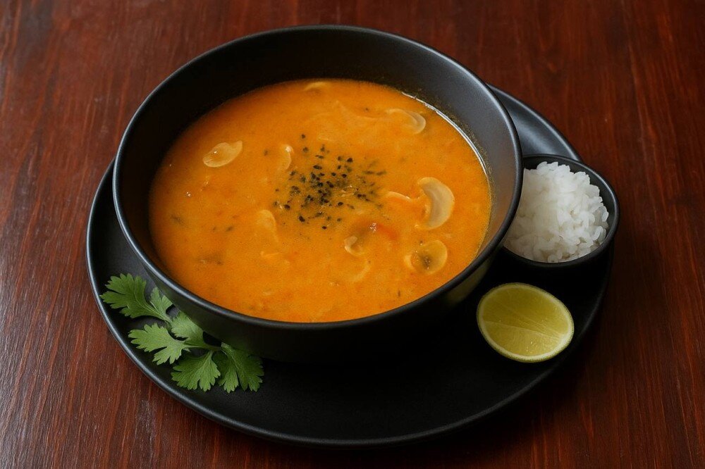 Бульон том ям, рис японский, мидии, лосось, креветки тигровые, помидоры черри, шампиньоны, лайм, перец острый чили