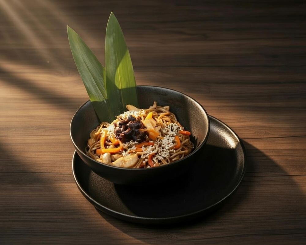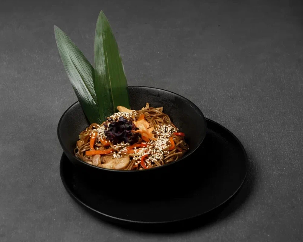 Соба, куриное филе, куриное филе, капуста пак чой, ростки сои, морковь, соус соевый, микрозелень, кунжут