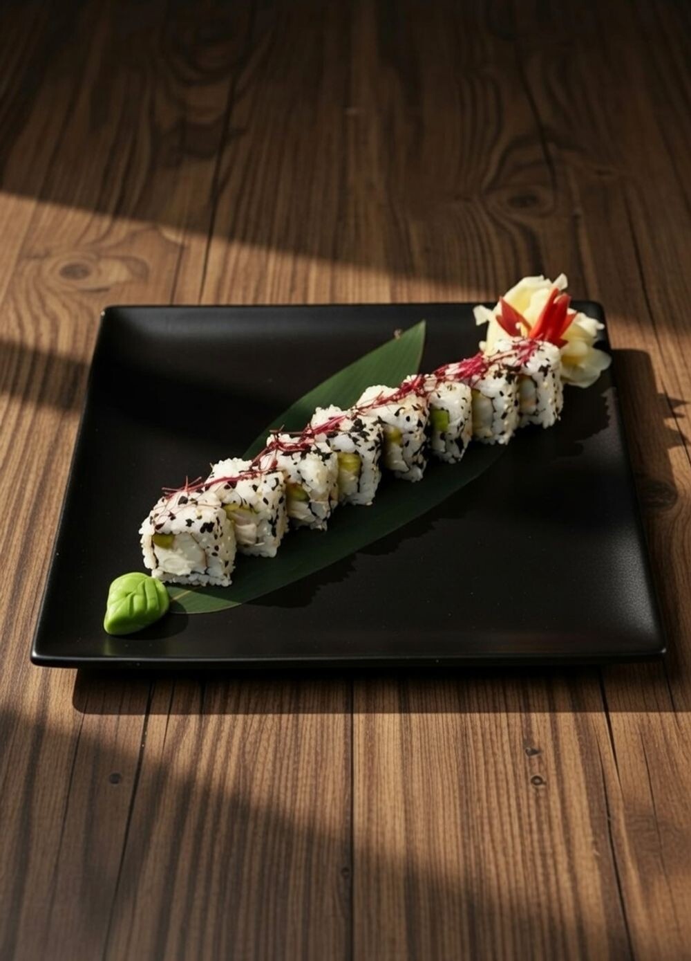 Нори, рис японский, сыр творожный, креветка тигровая, авокадо, кунжут
