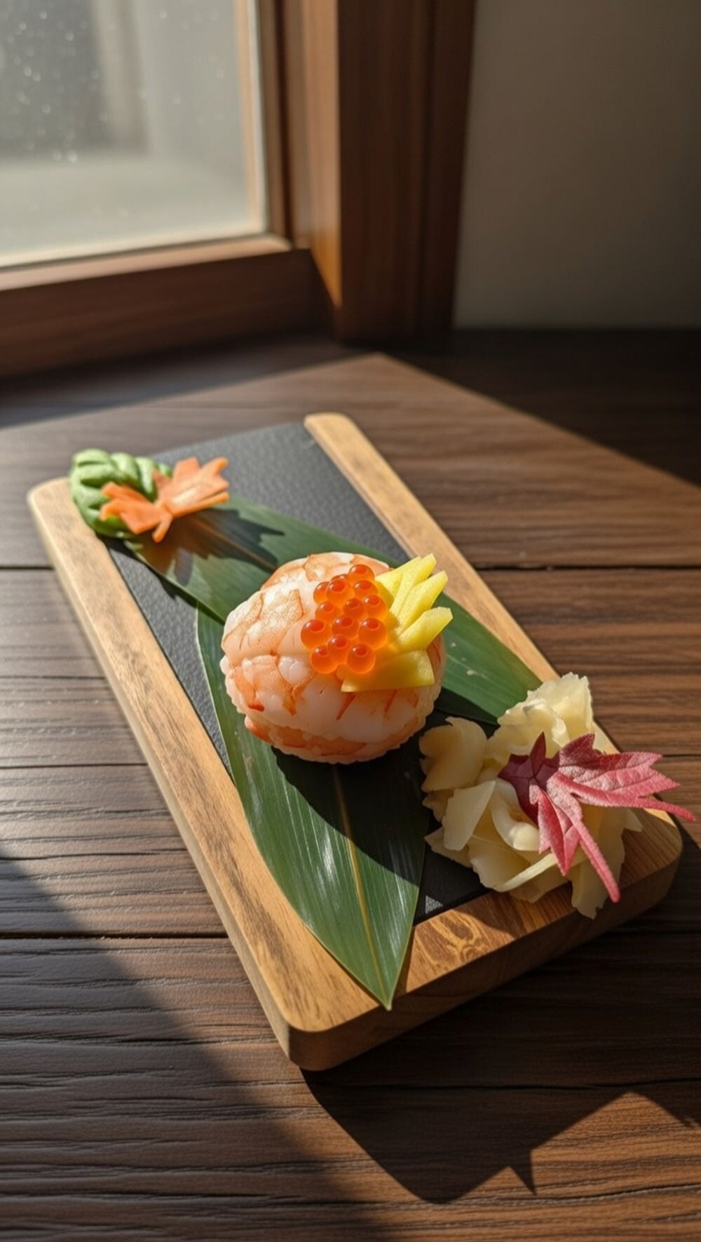 Рис японский, сыр творожный, креветки тигровые, икра тобико, икра красная, манго