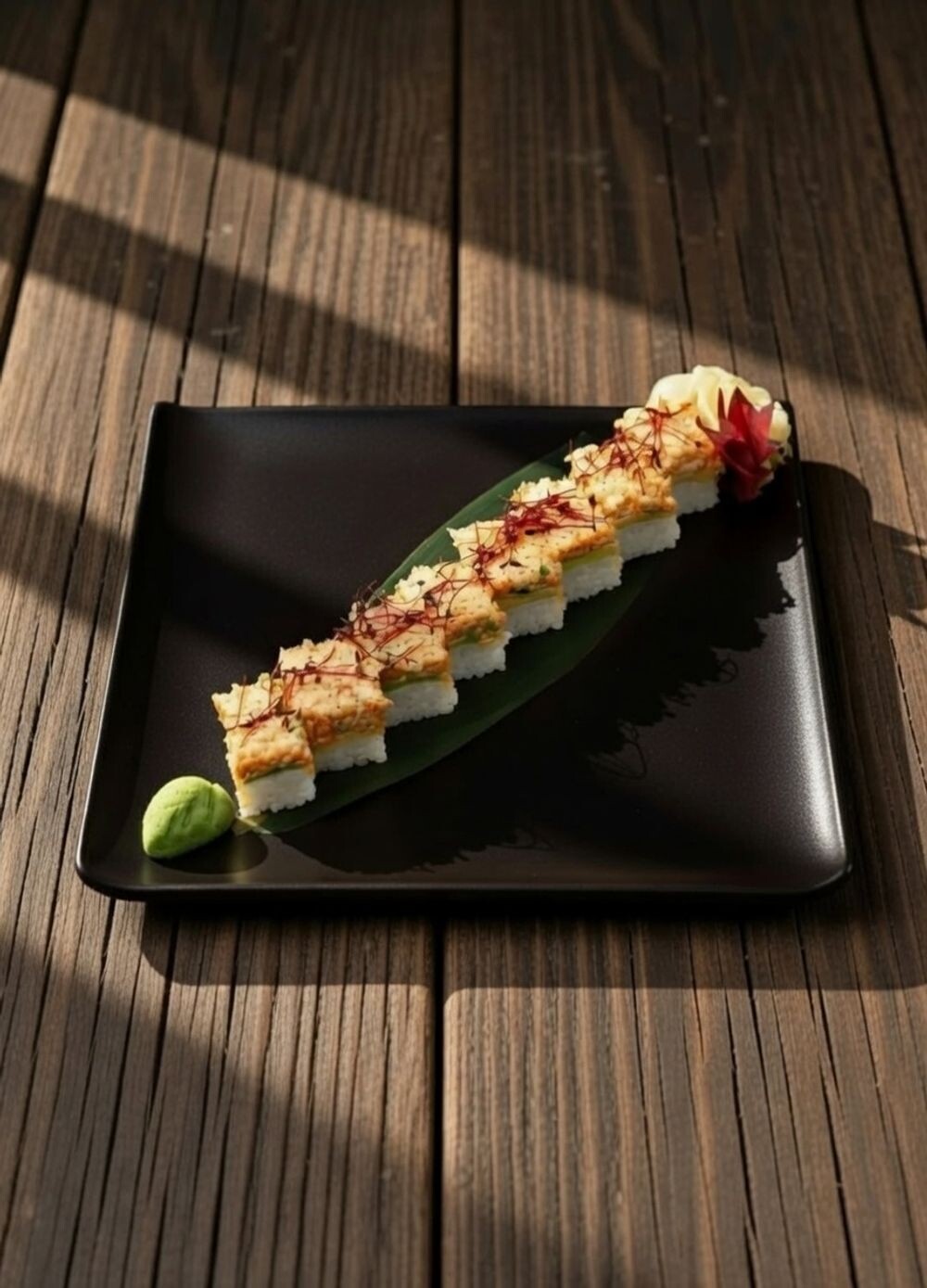 Рис японский, краб, икра тобико, авокадо, соус спайси, лук зеленый