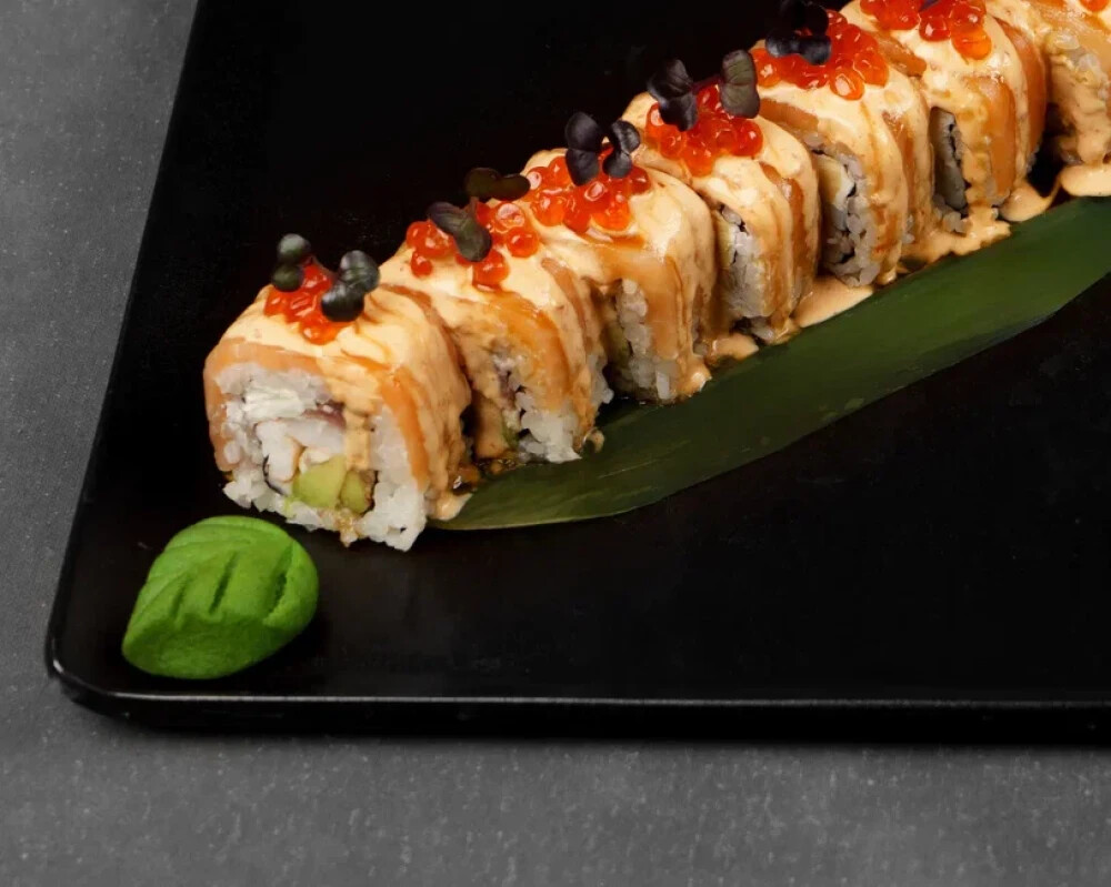 Нори, рис японский, сыр творожный, спайси соус, соус унаги, креветки тигровые, угорь, лосось, краб, тунец, икра красная, авокадо