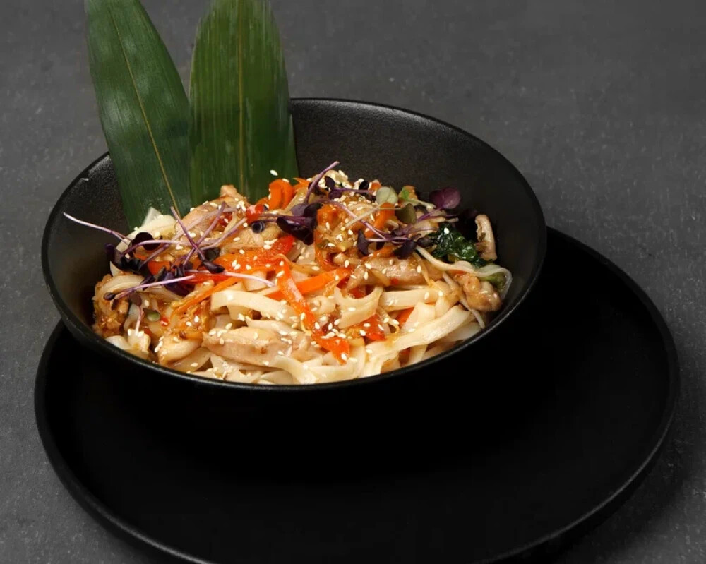 Лапша рисовая, перец болгарский, капуста пак чой, ростки сои, говядина, соус сладкий чили, лук порей, микрозелень, кунжут