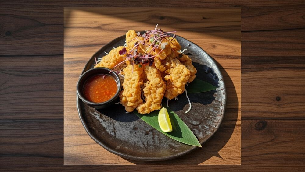 Фунчоза, куриное филе, лайм, соус соевый, соус кимчи, соус сладкий чили, кляр на основе японской муки