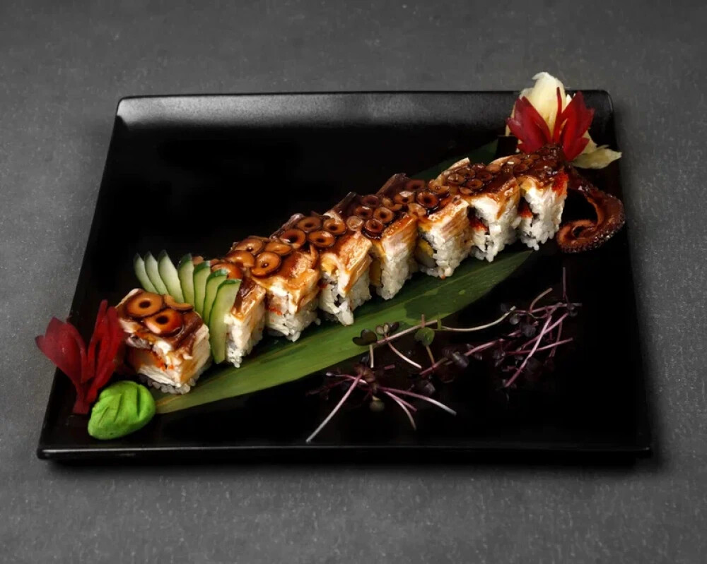 Нори, рис японский, сыр творожный, гребешок, осьминог, икра тобико, манго, соус устричный