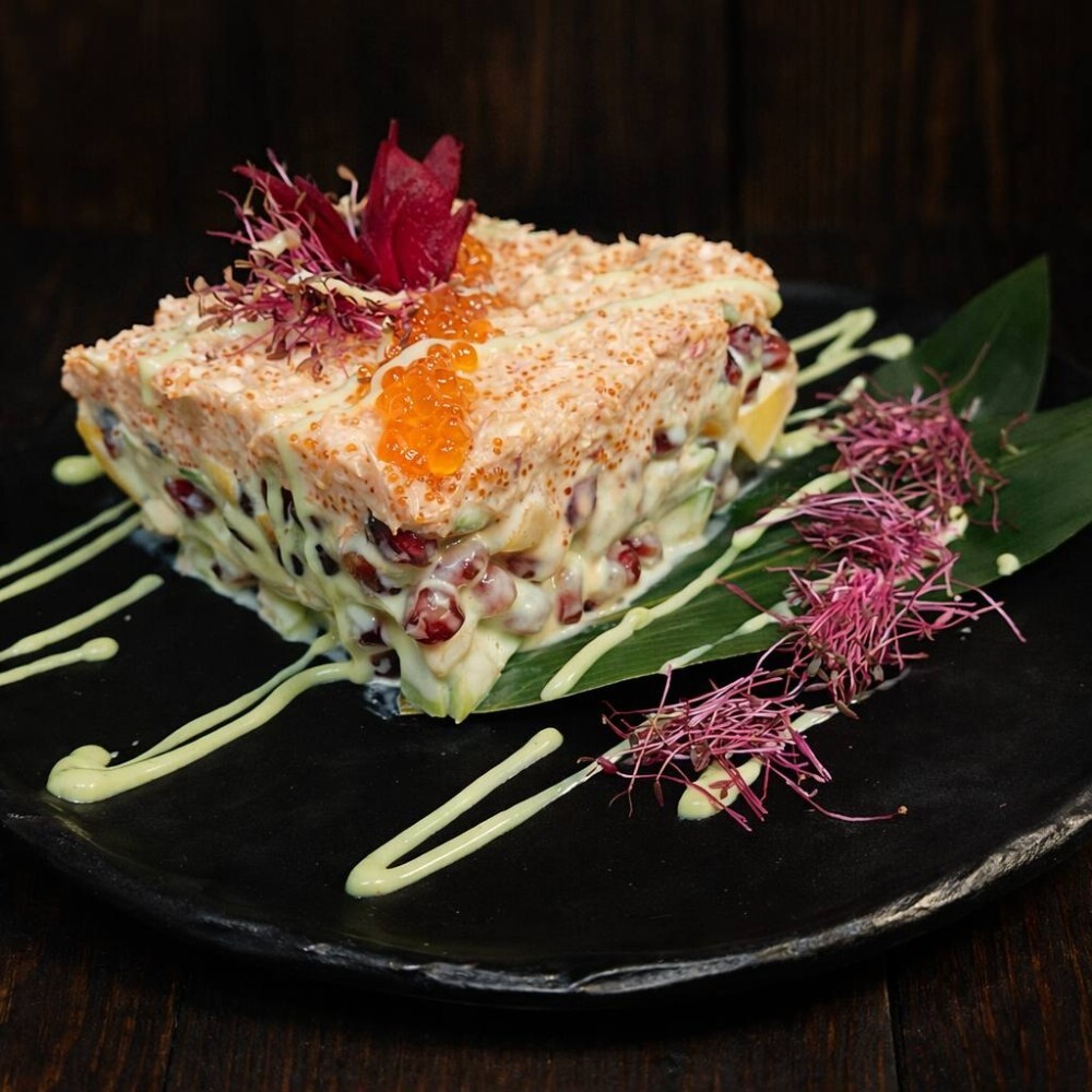 Сыр творожный, икра тобико, соус кимчи, авокадо, гранат, манго, фирменный соус на основе васаби, краб, икра красная, микрозелень
