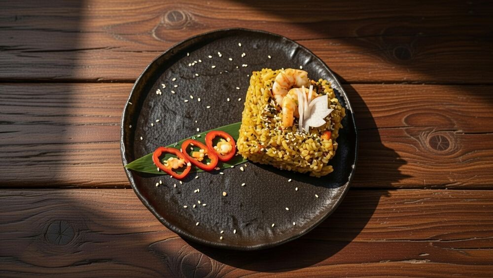 Рис японский, куриное филе, креветки тигровые, вешанки, перец болгарский, ростки сои, капуста брокколи, лук порей, яйцо, чеснок, микрозелень, соус на основе черного перца